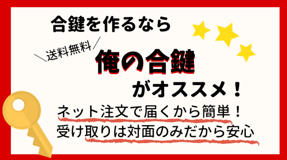 「鍵をなくした…」「スペアキーを作りたいけど、どこに頼めばいいか分からない」 そんな時に頼れるのが、ネットで簡単に注文できる【俺の合鍵】です。