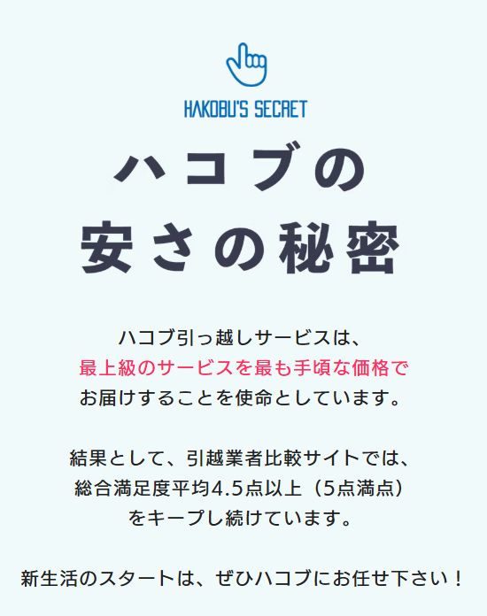 ハコブ引っ越しサービスは、業界最安値に挑戦し続けるコスパ抜群の引っ越し専門サービスです。10万件を超える実績と、平均4.5点以上の高評価が示すように、価格だけでなくサービス品質にもこだわっています。ベテランスタッフによるスピーディーで丁寧な作業、首都圏に複数拠点を持つことで実現した移動コストの最適化、訪問不要の電話見積もりなど、無駄を省きながら安心できる仕組みが整っています。WEBからは1分で簡単に自動見積もりができ、24時間いつでも依頼可能。梱包・開梱、不用品回収、ハウスクリーニングなどのオプションも充実しており、初めての引っ越しでも不安なく任せられるサービスです。
